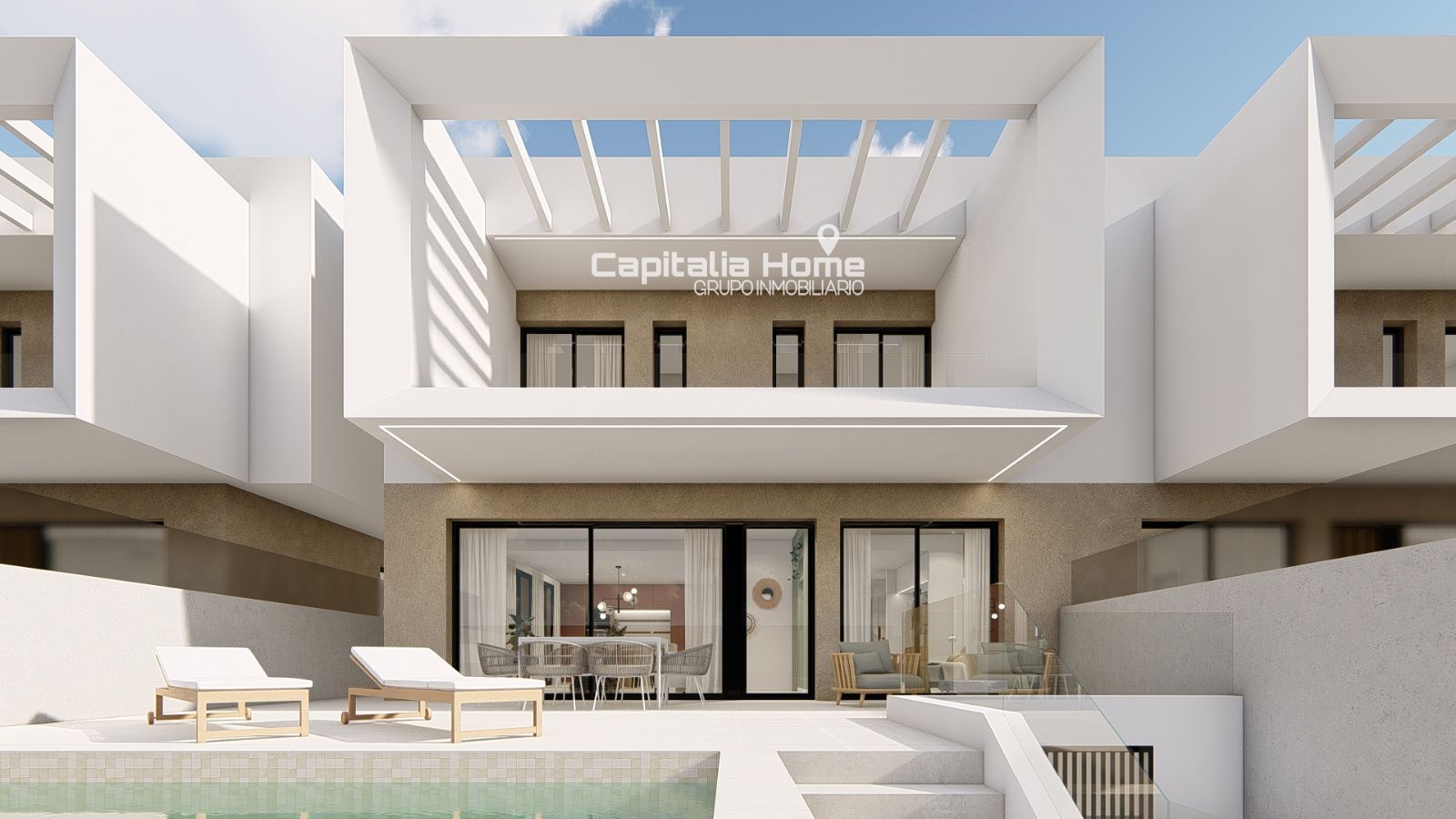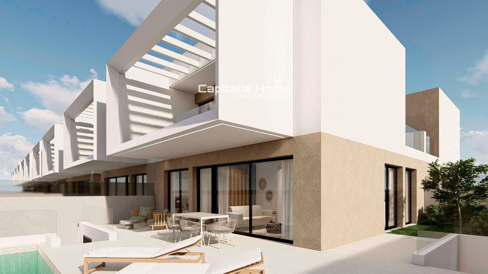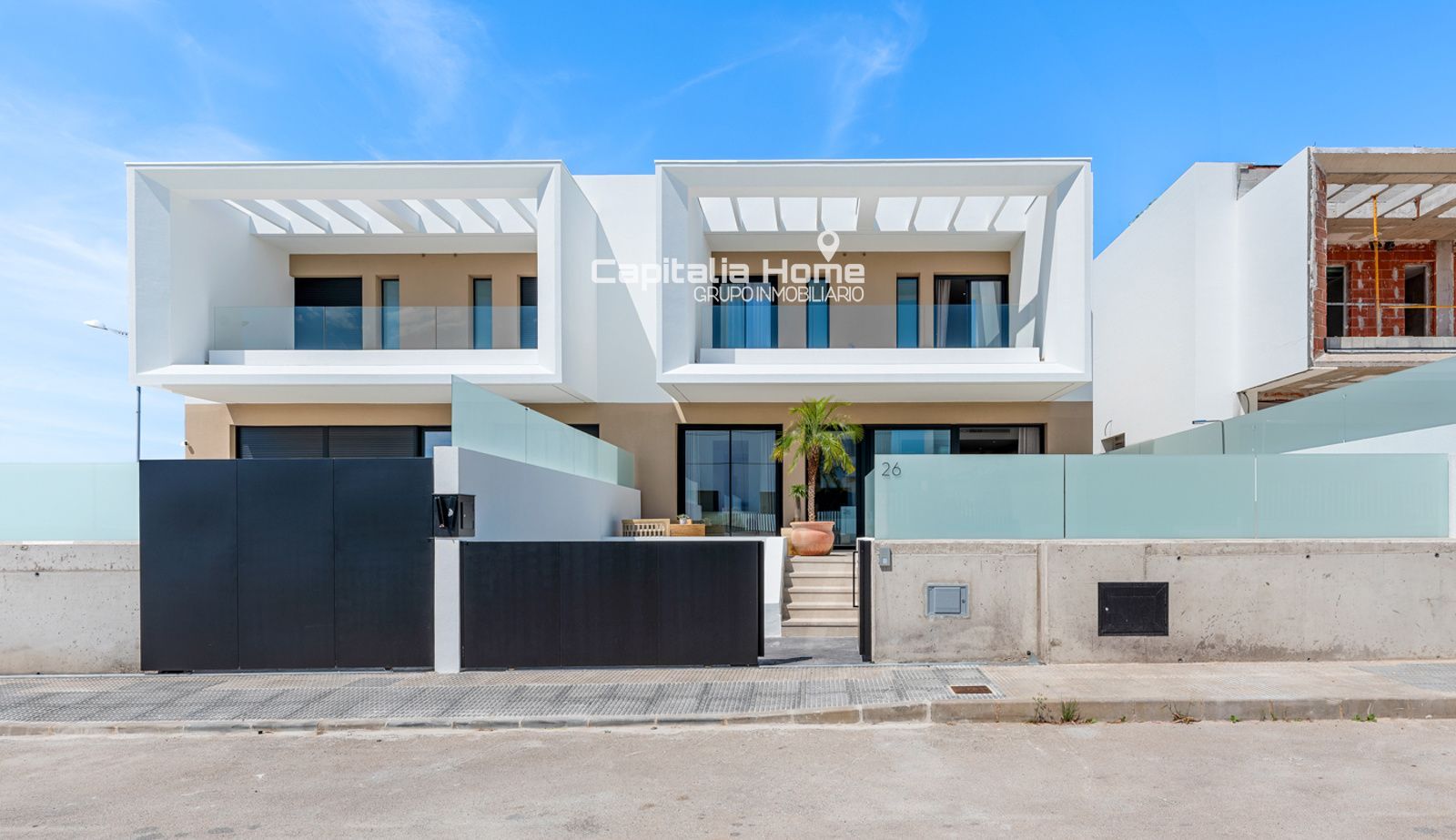 En el exterior, la vivienda ofrece un espacio privado pensado para el disfrute. Piscina con iluminación LED, zonas pavimentadas con hormigón impreso, césped artificial de bajo mantenimiento y cerramiento con valla metálica y cristal translúcido que aporta privacidad sin perder luminosidad. El acceso se completa con puerta corredera metálica motorizada, aportando comodidad y seguridad.