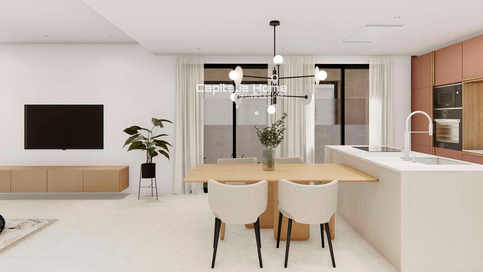 La cocina se convierte en uno de los grandes protagonistas: moderna, práctica y completamente equipada. Dispone de isla central, muebles altos y bajos y electrodomésticos integrados (inducción, horno, microondas, lavavajillas, frigorífico, lavadora y secadora), pensados para disfrutar tanto del día a día como de momentos especiales.